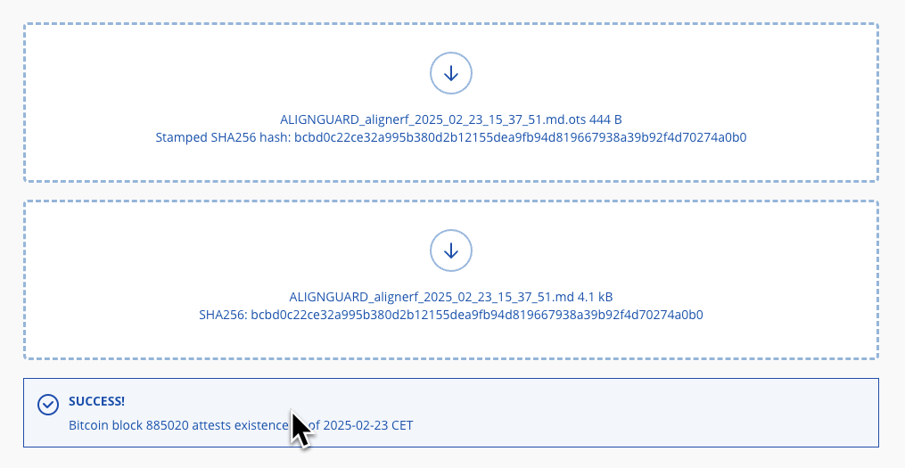 Upload both your original file and the OpenTimestamps (.ots) proof file to verify the timestamp.